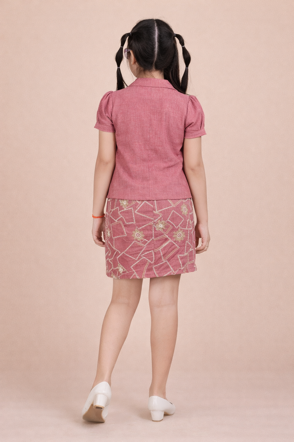 Let her step into effortless sophistication with this beautifully styled blush co-ord dress set. Featuring a printed inner dress paired with a smart buttoned jacket, this outfit blends elegance with modern charm.