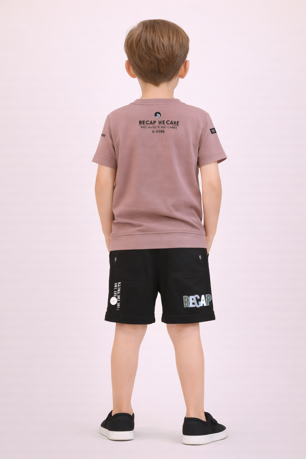 Add effortless style to your little one’s wardrobe with this trendy boys’ co-ord set featuring a mauve graphic t-shirt paired with classic black shorts.