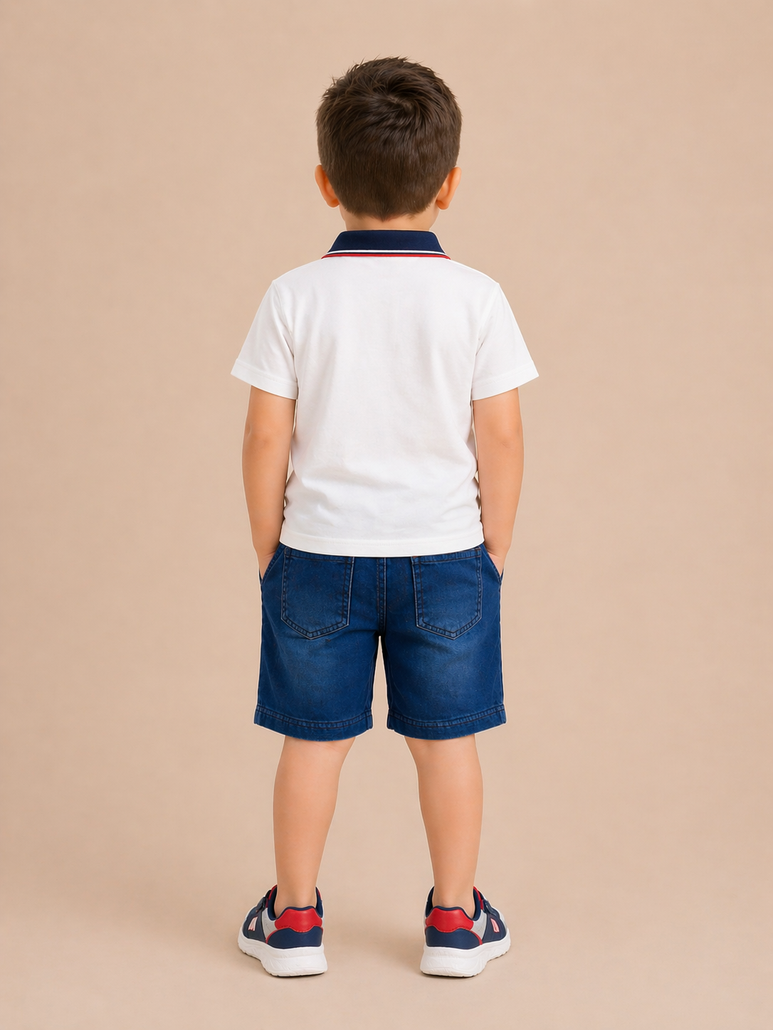 A trendy polo-style t-shirt paired with classic denim shorts, designed for a cool and polished look. The soft fabric offers comfort, while the stylish prints and collar detail make it ideal for outings, playdates, or casual occasions.