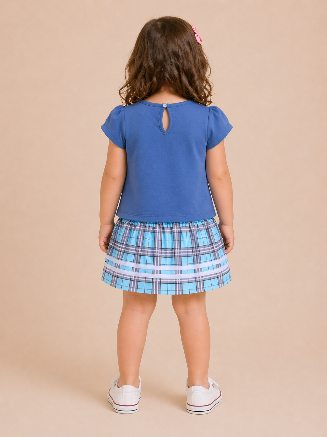Girls Blue Top with Checkered Skirt Co-ord Set