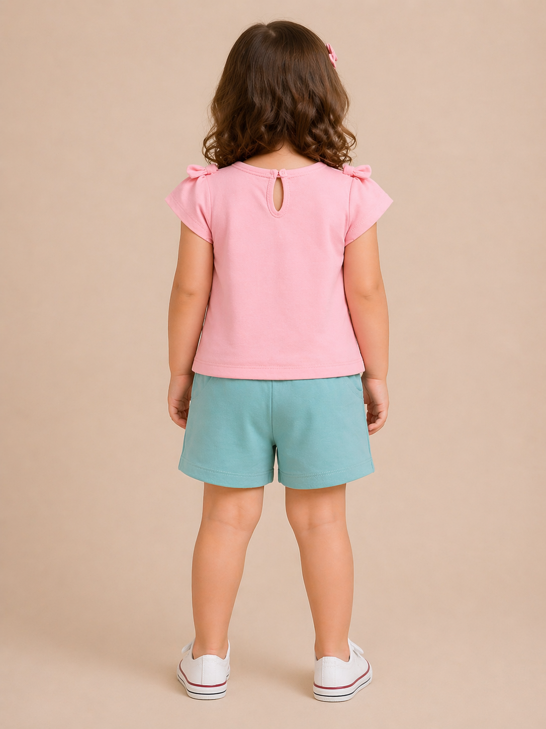 A cute and playful outfit featuring a soft pink top with a charming house print paired with mint green shorts. Designed with breathable interlock fabric, this set ensures all-day comfort and ease of movement. Perfect for casual outings, playtime, or summer days.