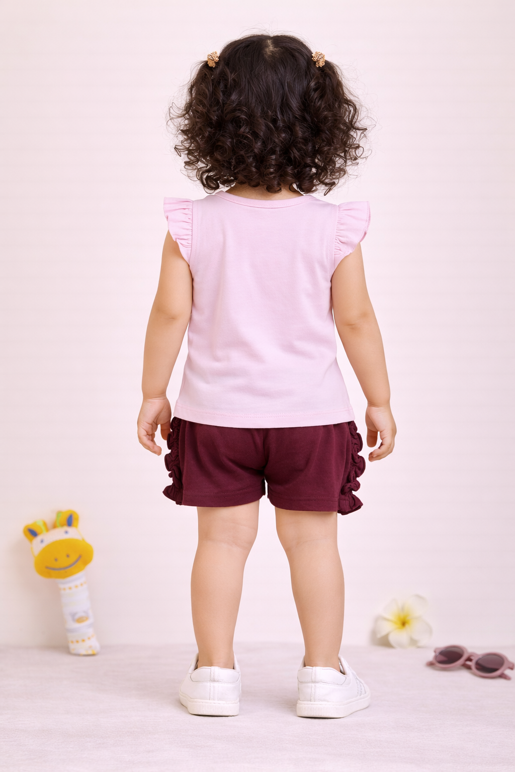 A soothing pastel look with a meaningful touch. This pink top with delicate floral artwork is paired with rich maroon shorts, creating a balanced and elegant outfit ideal for casual outings and cozy days.