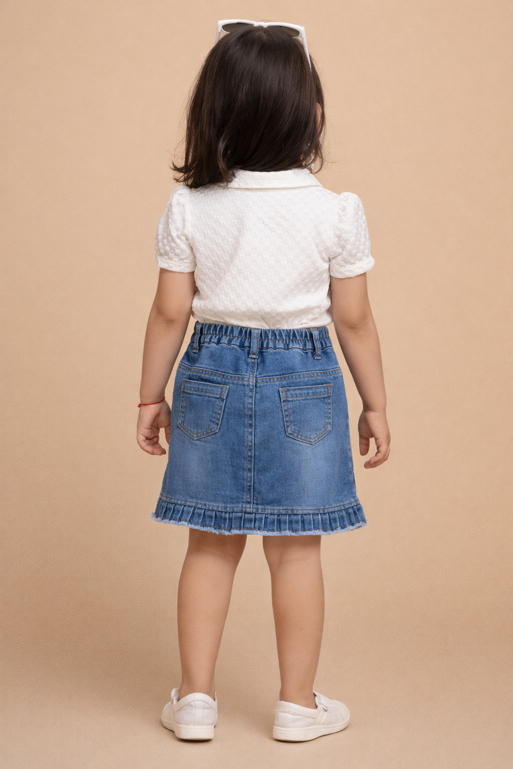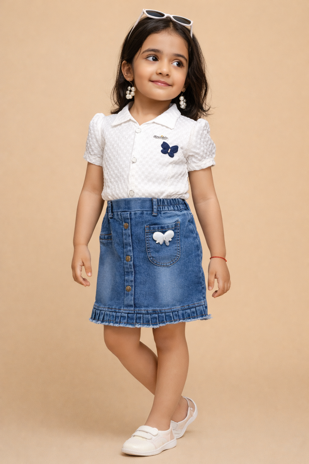 Add a touch of effortless elegance to your little one’s wardrobe with this charming denim skirt set. The soft textured white top brings a classic, graceful feel, while the button-front denim skirt adds a playful twist with cute detailing. Designed for comfort and style, this outfit is perfect for casual outings, birthday parties, or special day-outs where she wants to shine