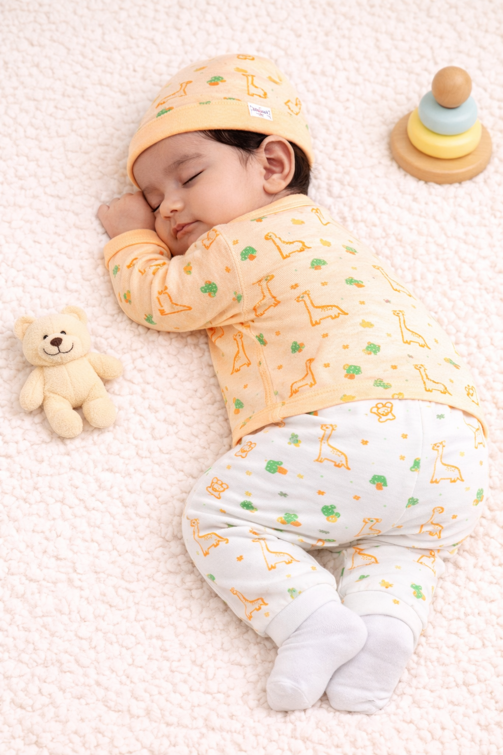 This adorable peach newborn set features playful dino prints, adding a fun touch to your baby’s wardrobe. Crafted from soft, skin-friendly fabric, it ensures maximum comfort throughout the day. The easy-to-wear front-open top, coordinated pants, and cap make it a perfect choice for both comfort and style.