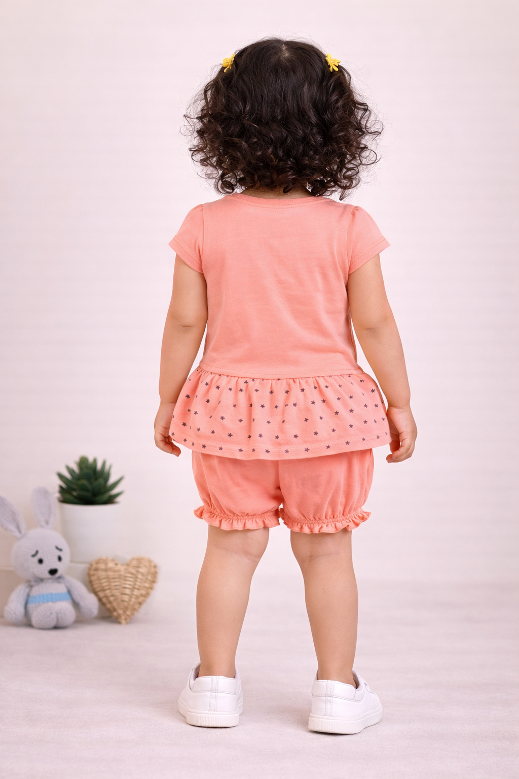 Sweet and stylish, this peach co-ord set features a charming “Love” print with a cute frill hem detail. Paired with matching shorts, it offers a soft, breathable fit perfect for everyday comfort and playful moments.