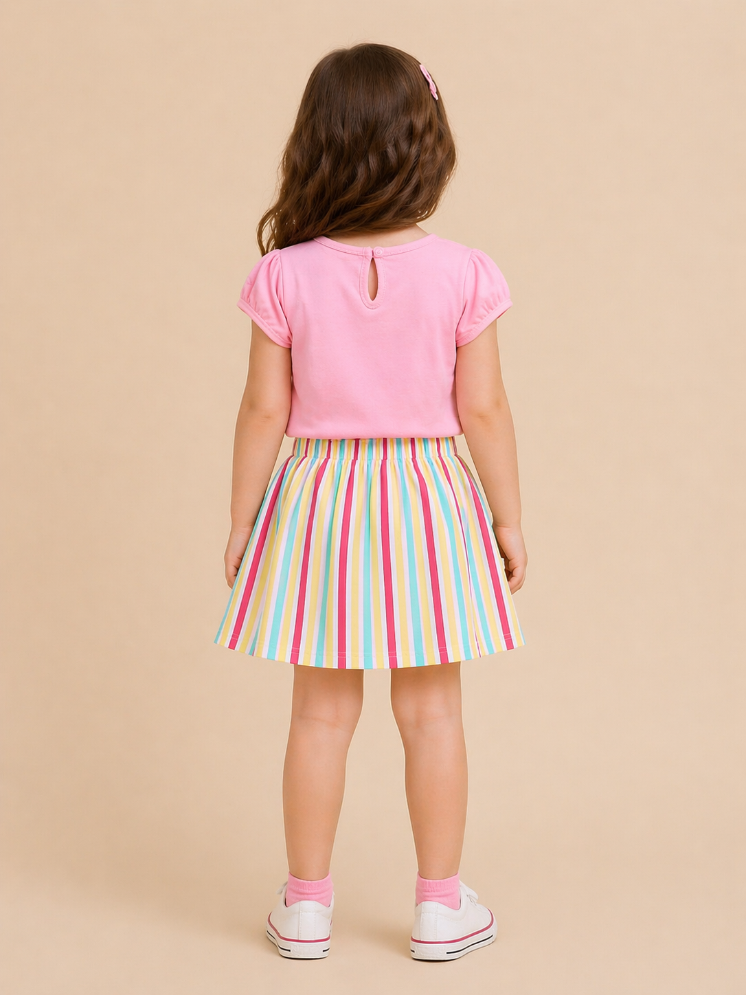 A vibrant and eye-catching outfit featuring a soft pink top paired with a colorful pleated skirt. Perfect for parties and special occasions, this set adds a fun and lively touch to your child’s wardrobe.
