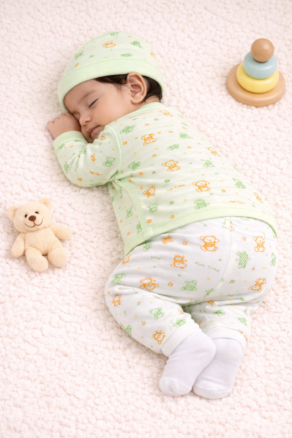 A soothing green newborn clothing set designed to keep your baby comfortable all day. Made with soft, breathable fabric, it feels gentle on delicate skin. The front-open top allows easy dressing, while the matching printed pants and cap complete the look. Perfect for daily wear, naps, and cozy cuddles.