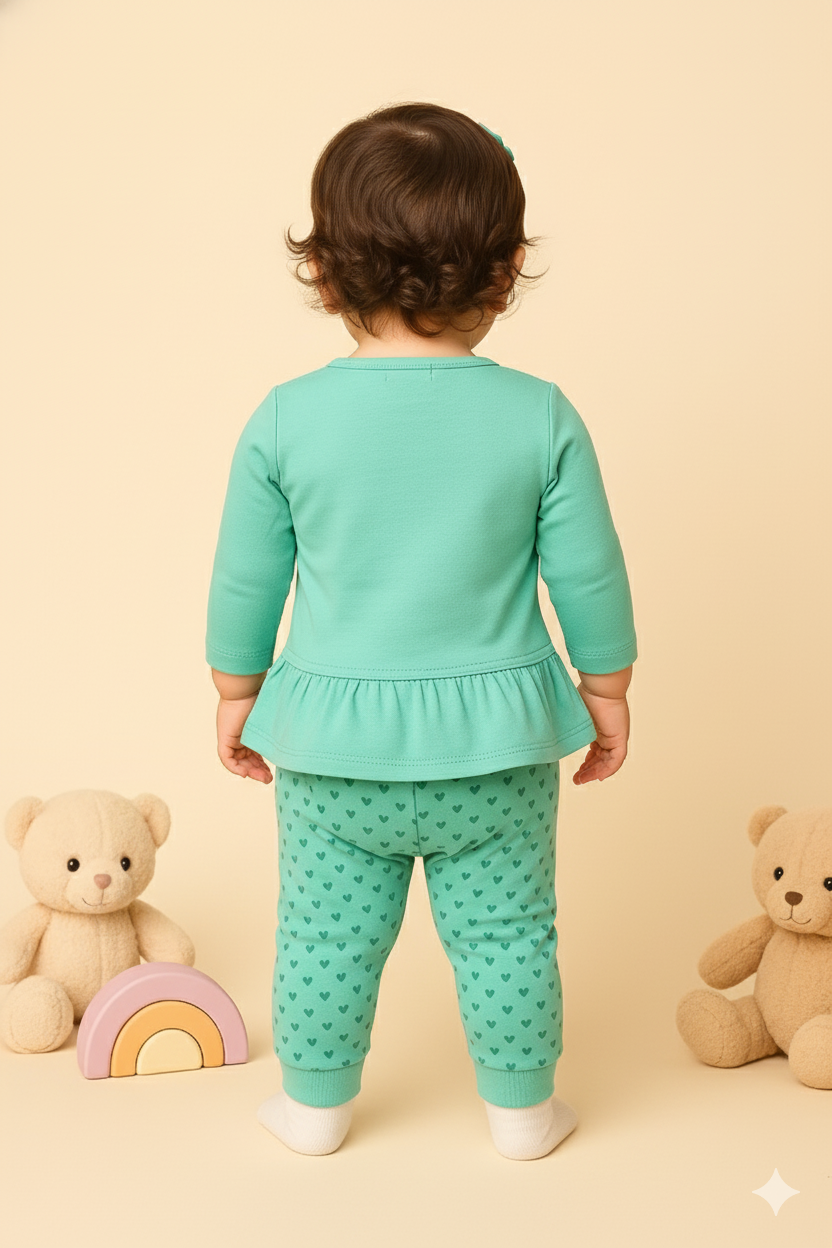 ” Let her shine in minty freshness! This soft cotton top and pant set brings breezy comfort and playful charm to her winter days. “