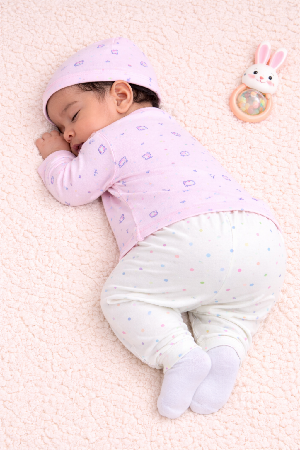 Delicate and adorable, this pink newborn set is crafted for comfort and style. The soft fabric is gentle on your baby’s skin, while the minimal prints add a sweet touch. With an easy-to-wear top and cozy pants, this set is perfect for everyday comfort and peaceful sleep.