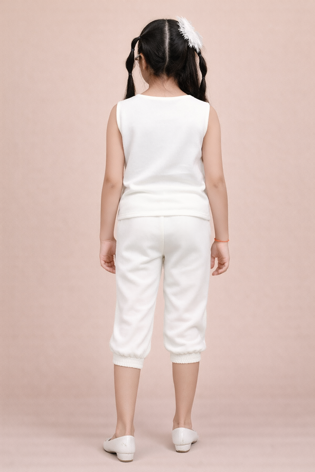 Designed for little explorers with big smiles, this super-cute co-ord set brings comfort and joy together. The sleeveless top with a happy graphic pairs perfectly with relaxed-fit jogger pants, making it ideal for travel days, playtime, or casual outings. Lightweight, breathable, and full of personality—this outfit lets her move freely while looking effortlessly stylish.