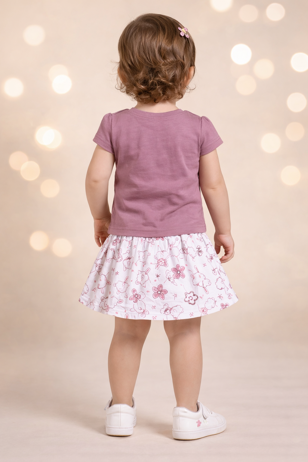 Add a touch of sweetness to her everyday style with this adorable toddler girls’ top and skirt set. The soft purple t-shirt features a charming unicorn print with playful details, paired beautifully with a white printed skirt adorned with cute bow accents.